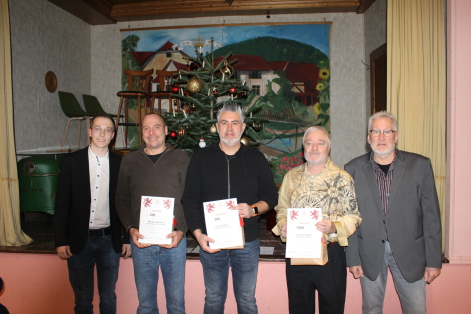 Das Team der "Krone" tischte ein vorzügliches Buffet auf, das für jeden etwas bereit hielt. Nachdem alle ihren Hunger gestillt hatten, nahmen KSO Christian Vogel und sein Stellvertreter Klaus Ehrhard Ehrungen verdienter Schiedsrichterkameraden vor:
