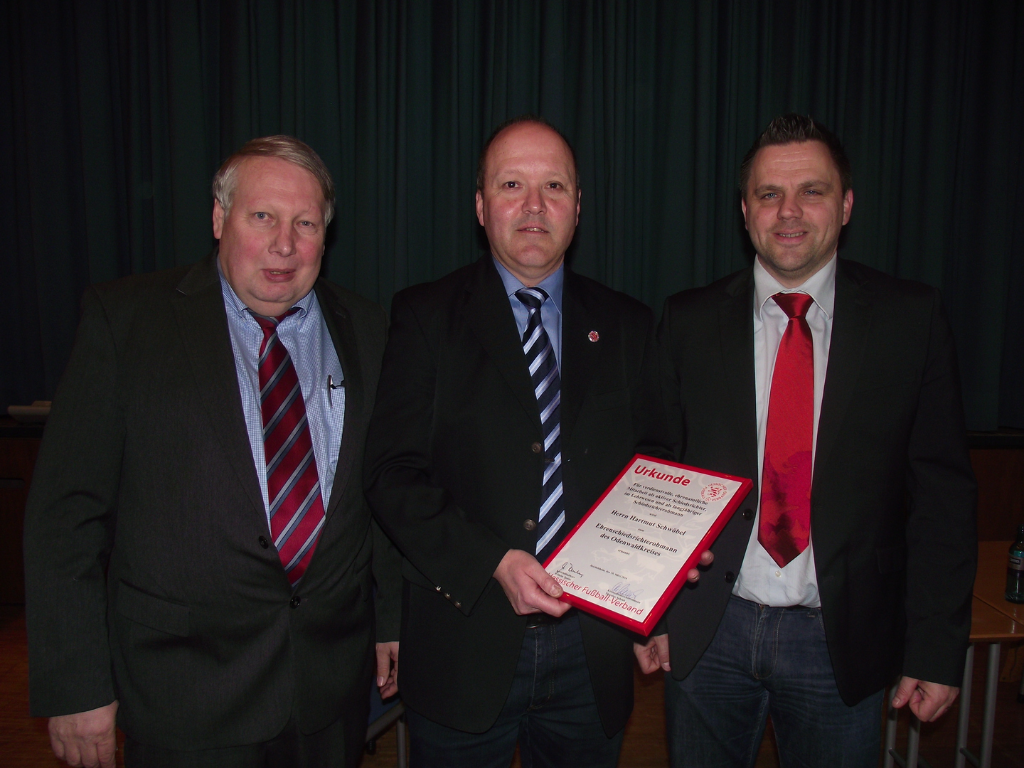 Im Rahmen der Veranstaltung wurden auch vier Anträge unserer Vereinigung postitiv beschieden. In einem dieser Anträge hatten wir unseren ehemaligen KSO Hartmut Schwöbel zur Ernennung als Ehrenkreisschiedsrichterobmann vorgeschlagen. Diesem kamen die Vereine einstimmig nach, so dass wir nach Gottfried Matiaske nun einen zweiten Ehren-KSO in unserer Vereinigung haben.