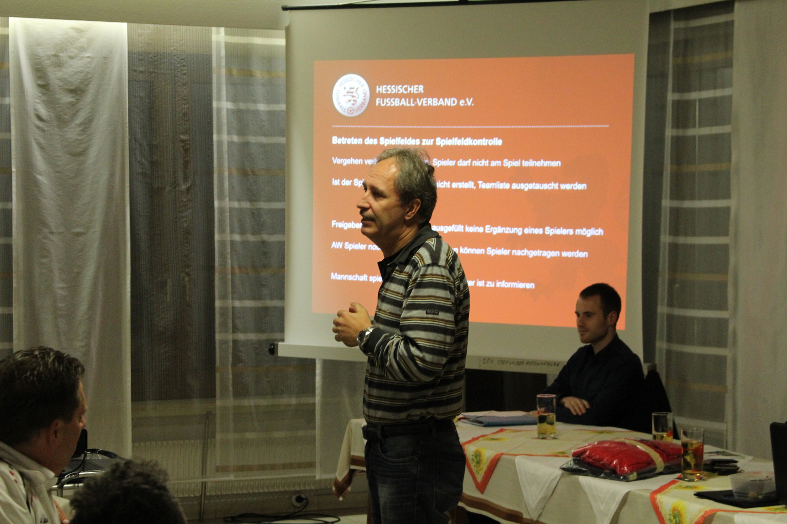 Er referierte über die Änderungen in der Strafgewalt des Schiedsrichters. Dort gab es zum Saisonstart einige gravierende Neuerungen, die nun nochmals vertieft wurden. So kann der Schiedsrichter einen Spieler nun z.B. schon vor dem Spiel ausschließen.