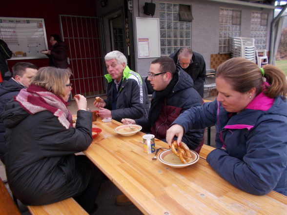 Unter der Führung von Ehren-KSO Hartmut Schwöbel machten sich dann zunächst über zehn Personen auf den Weg (leider war vom Winter noch nicht viel zu sehen) über den Schanzenbuckel und unterhalb des Heubergs vorbei nach Zell, wo am Vereinsheim der örtlichen TSG eine zünftige Rast eingelegt wurde.