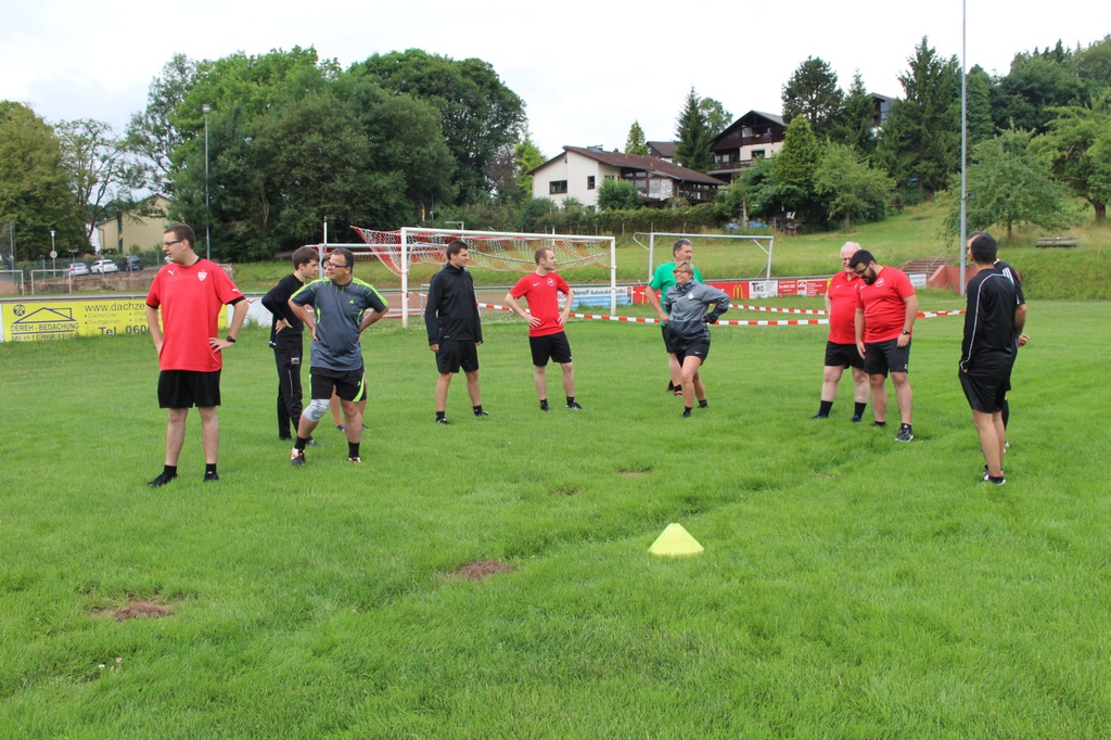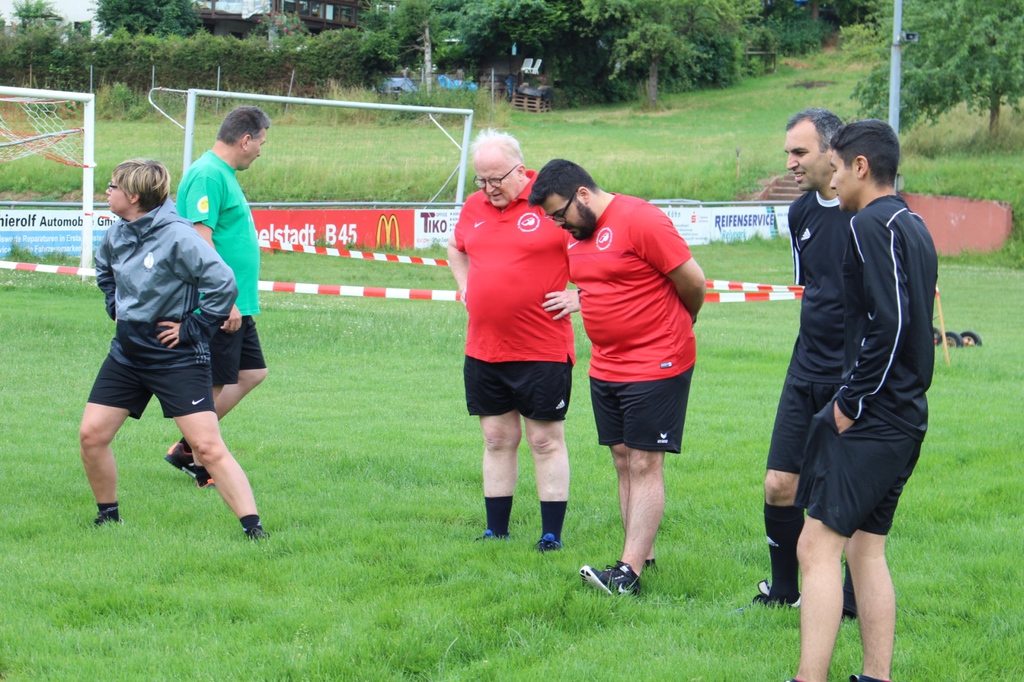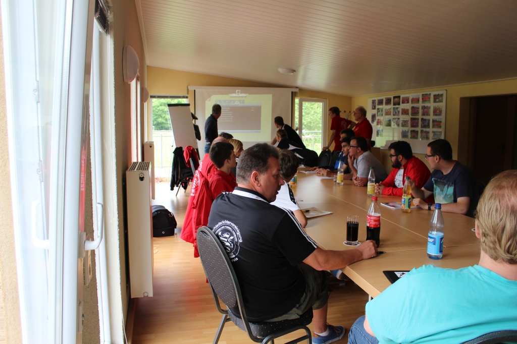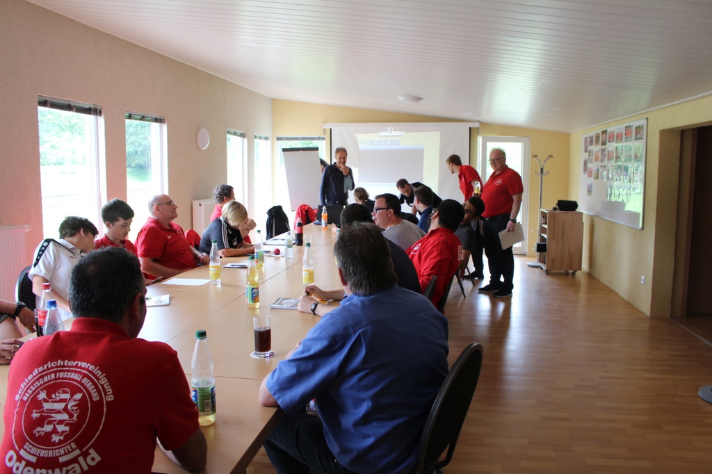 Der Lehrstab hatte sich viel vorgenommen. Nach dem Frühstück ging es gleich ans Eingemachte: Wie in den Vorjahren durfte die Praxis nicht fehlen. Einzeln ging es raus auf dem Rasen und kleine Videoszenen wurden gedreht. Der SR war gefordert, auf eine Situation zu reagieren, die kurz vorher erläutert wurde. Hierbei sollten sie nacheinander zeigen, wie sie mit einem „Meckerer“ oder einem „Problemspieler“ zurechtkommen, die bei einem vermeintlichen Fehlpfiff gleich pöbelten oder gar beleidigten.