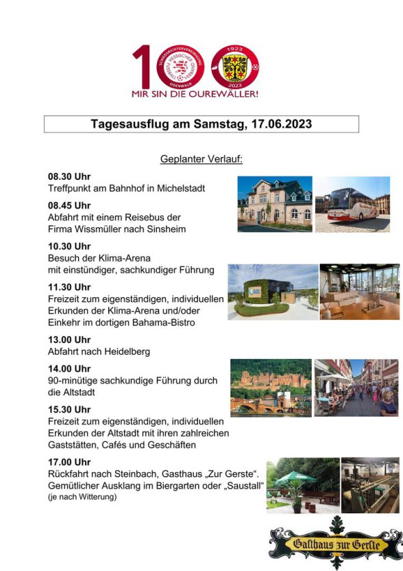 Im Rahmen der Feierlichkeiten zum 100-jährigen Jubiläum findet am Samstag, 17.06.2023, ein Tagesausflug statt. Einzelheiten sind der u.a. Veröffentlichung zu entnehmen:
